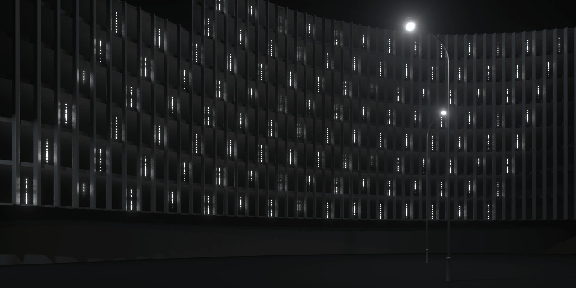 The lighting installation made up from one hundred twenty programmable LED poles explores the physical phenomenon of wave motion and its forms. An example may be the energy of a vibrating movement of a particle which is progressively transferring to the other particles in its surroundings. The consequence is the fact that the energy of the vibrating movement spreads in space gradually and is transferred to even more distant particles. In this way one can perceive a certain change occurring in the substance, a sort of agitation. These phenomena are transposed by the Hyperbinary studio into the visual or audiovisual form, which gives birth to a work of art able to explore its very own form since the light and sound represent a form of wave.